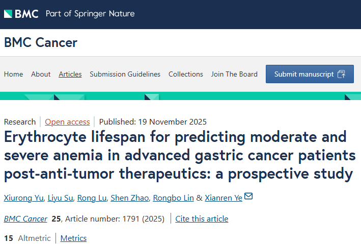 最新報道—《紅細胞壽命預測晚期胃癌患者抗腫瘤治療后中度及重度貧血:一項前瞻性研究》(譯)